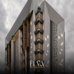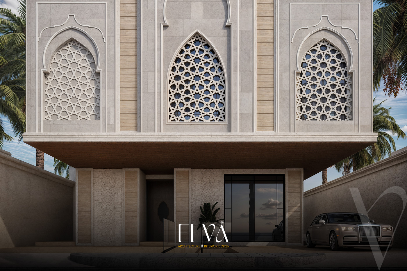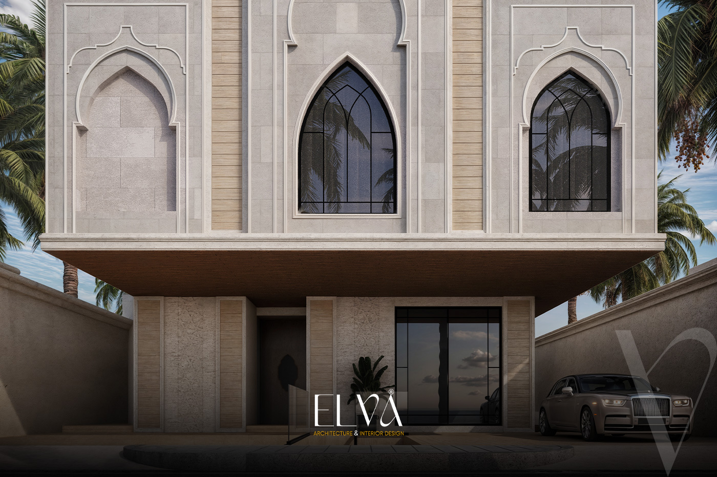 A façade that fuses authenticity and luxury, inspired by traditional Islamic architecture with a modern twist. Arabic motifs are reflected in the arches and windows, adding a refined decorative touch that enhances cultural identity. Natural stone in soft tones evokes a sense of serenity and grandeur, complemented by vertical lines for visual balance. Wooden textures blend harmoniously with stone elements, adding warmth and elegance. The pointed arches create a rhythmic visual flow, giving the façade a timeless and distinguished presence.