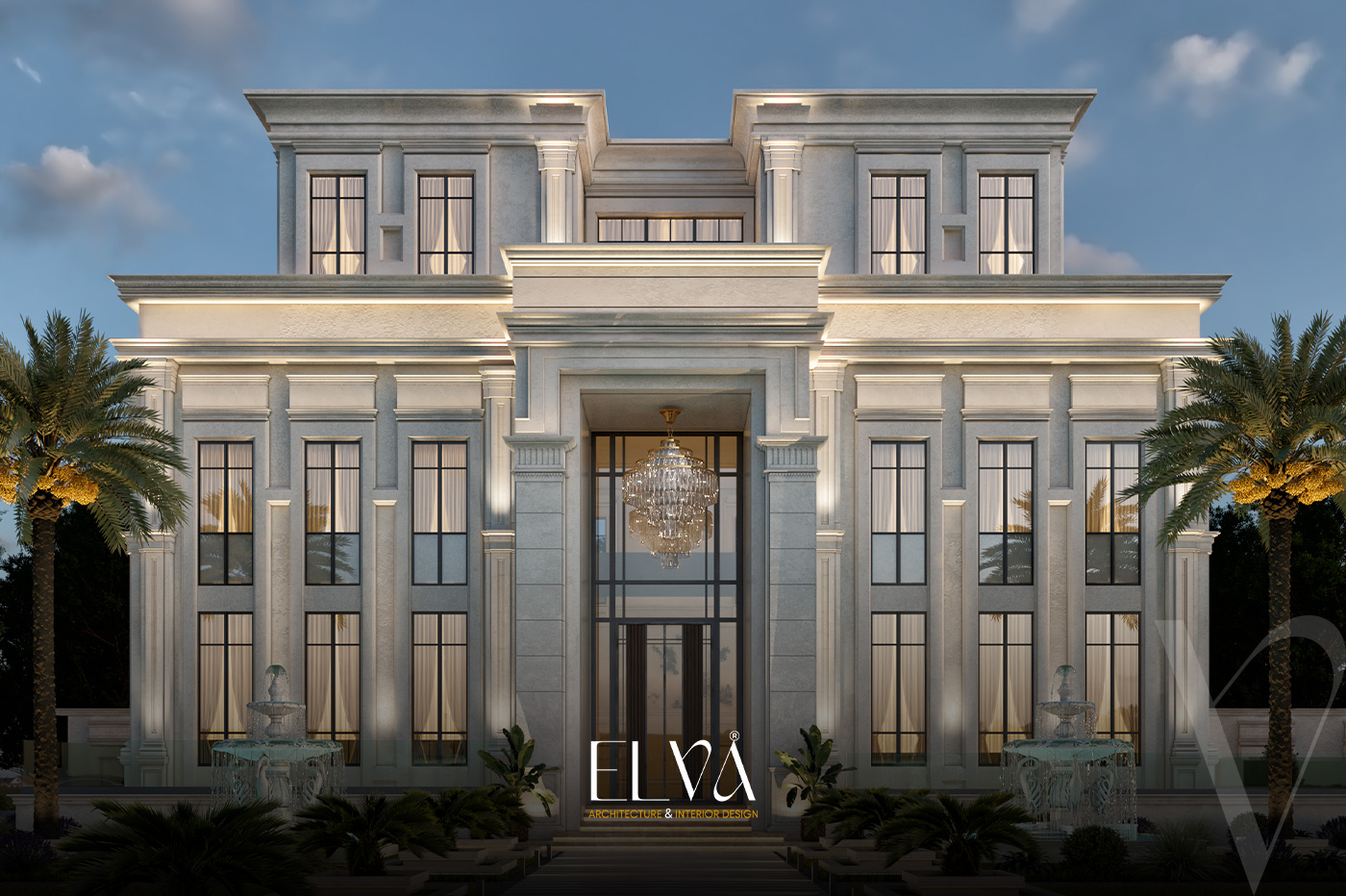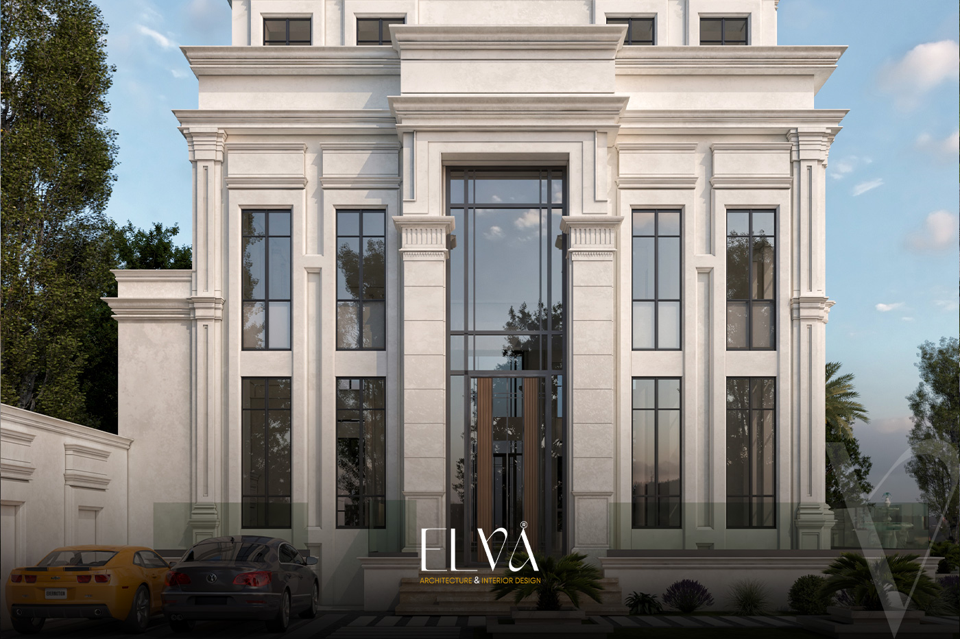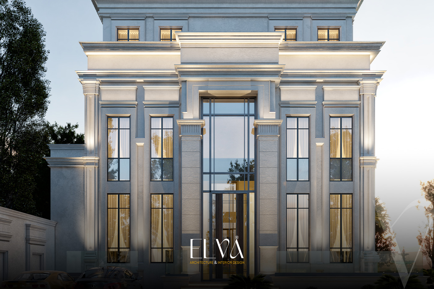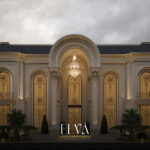 A grand classical villa façade that fuses architectural majesty with intricate detailing, where towering columns crowned with ornate capitals define the regal presence. Arched embellishments and elongated windows flow harmoniously across ivory-toned natural stone, giving the façade a balanced and commanding elegance. Finely crafted railings and a stately main entrance complete the opulent ensemble. Every element, from carvings to spatial symmetry, narrates a timeless tale of aristocratic classical splendor.