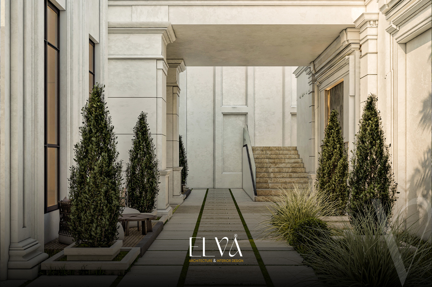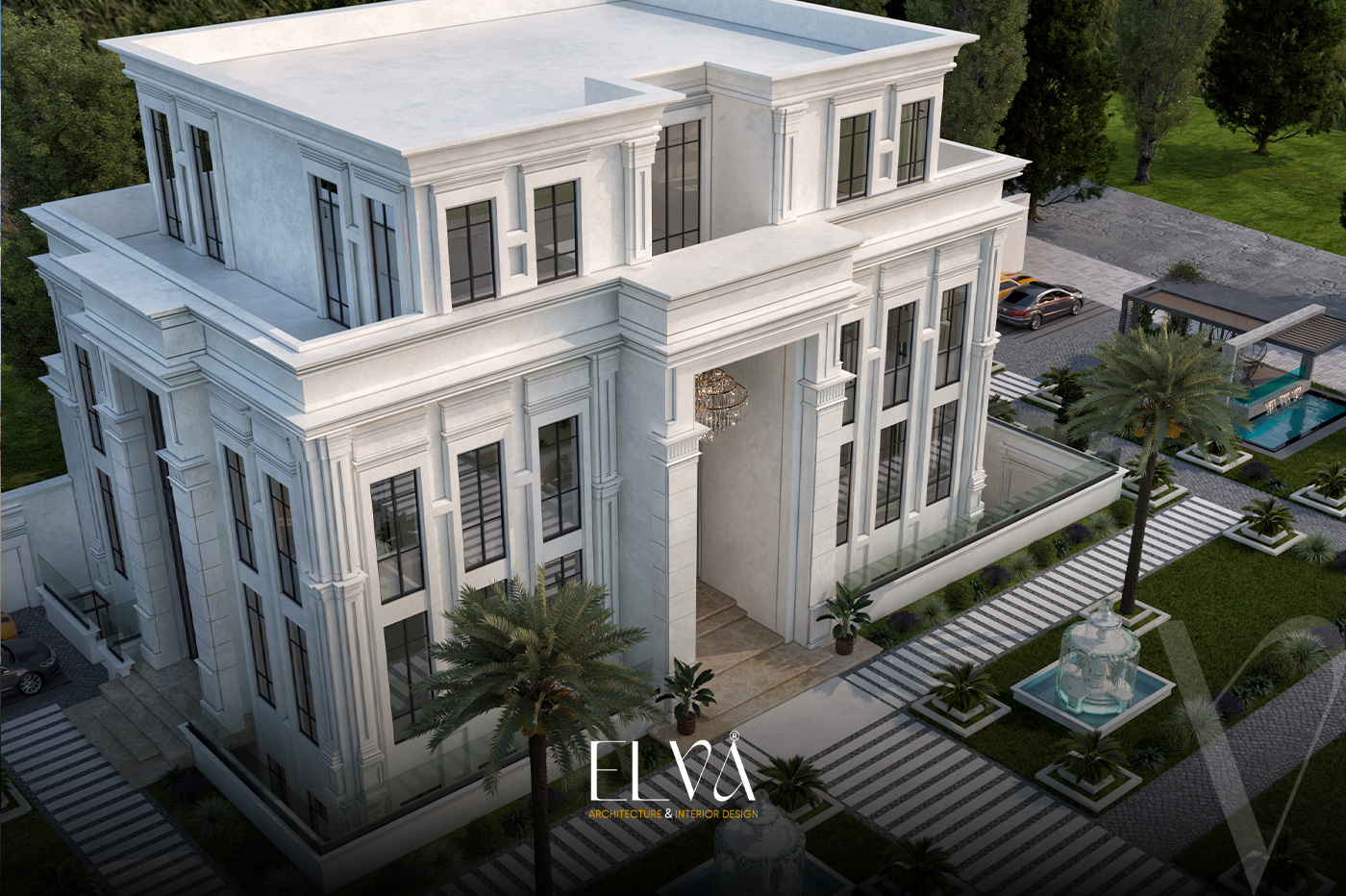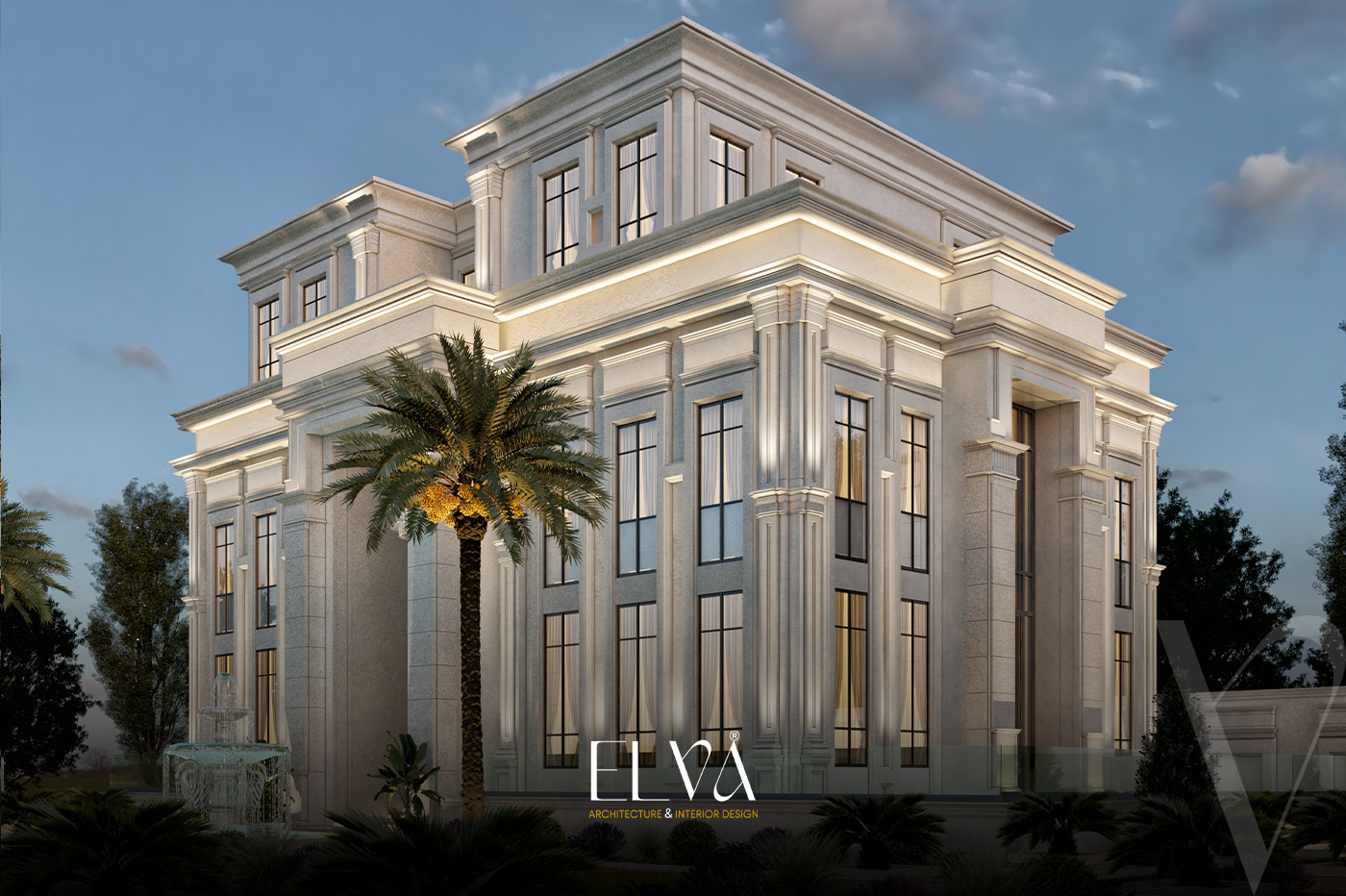 A grand classical villa façade that fuses architectural majesty with intricate detailing, where towering columns crowned with ornate capitals define the regal presence. Arched embellishments and elongated windows flow harmoniously across ivory-toned natural stone, giving the façade a balanced and commanding elegance. Finely crafted railings and a stately main entrance complete the opulent ensemble. Every element, from carvings to spatial symmetry, narrates a timeless tale of aristocratic classical splendor.