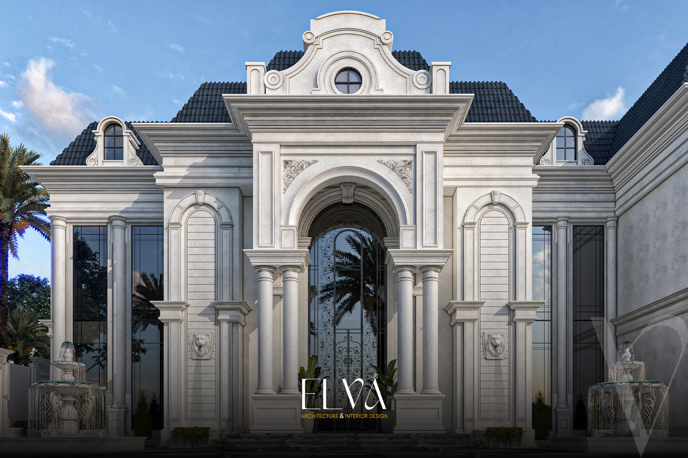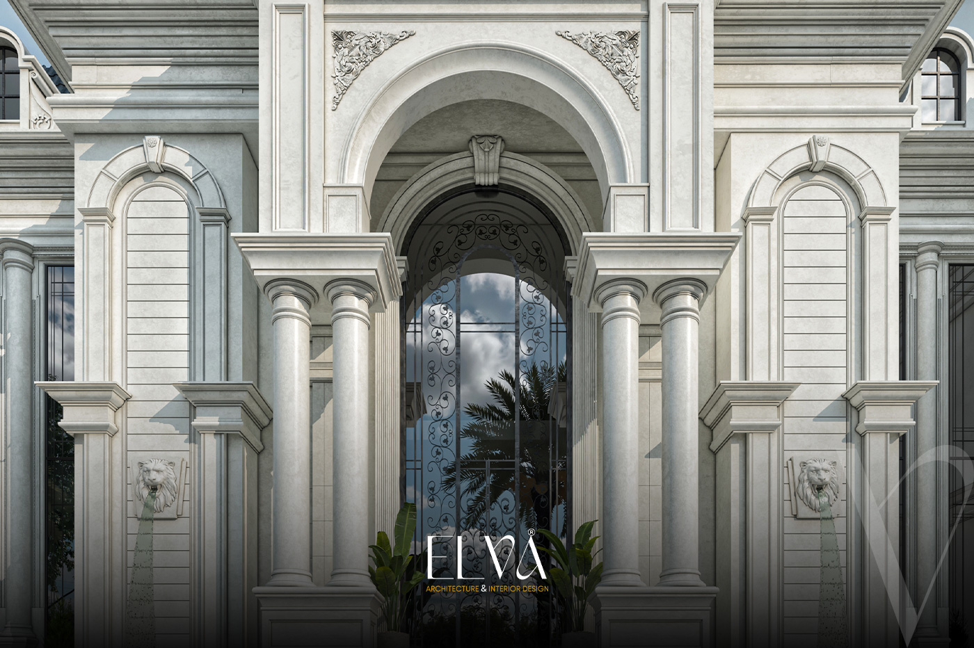 Tall arched windows and grand columns enhance the villa’s majestic character.