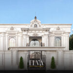 The façade blends timeless classical elements with modern touches for a striking presence.